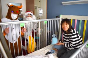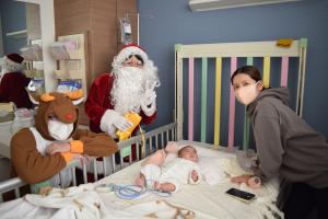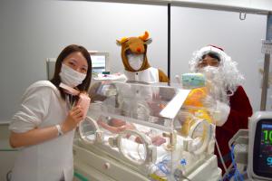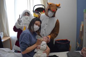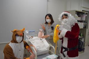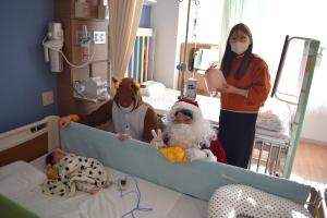 クリスマスイブ(12/24)に、小児科の入院患者さんに、職員扮するサンタクロースとトナカイがクリスマスプレゼントを届けました。治療を頑張るお子さんたちに、少しでも笑顔の時間を届けられたらという思いで行いました。
