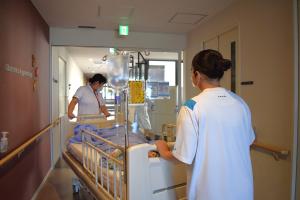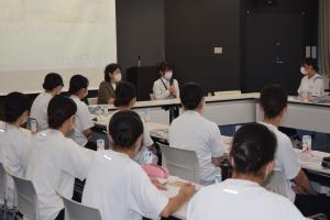 午前中は8病棟に分かれ、先輩の看護師に教えてもらいながら、慎重に血圧測定・ベッド移動・車いす介助などを体験しました。「緊張した~!」、「赤ちゃんかわいい」と笑顔いっぱいのフレッシュな高校生に、職員も元気をもらいました。